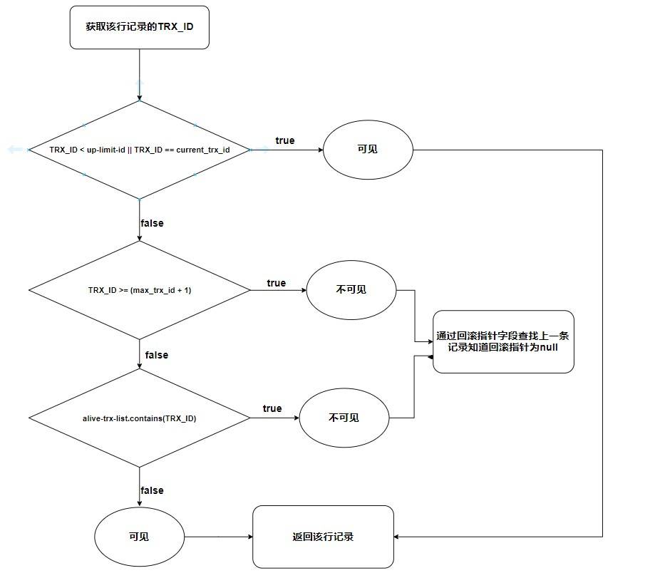 - 然后判断这条记录的 DB_TRX_ID 是否 大于等于 low-limit-id。如果大于等于则说明此事务无法看见该条记录,不然就进入下一轮判断。