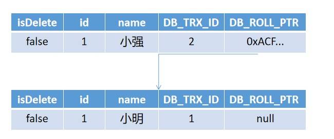 而 MVCC 使用的是其中的 事务字段,回滚指针字段,是否删除字段。我们来看一下现在的表格(isDelete是我自己取的,按照官方说法是在一行开头的content里面,这里其实位置无所谓,你只要知道有就行了)。