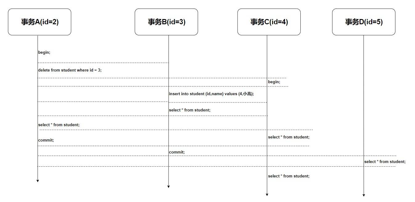 后面事务A和事务B都进行了提交的动作,并且有一个事务D进行了快照读,此时视图还是如此