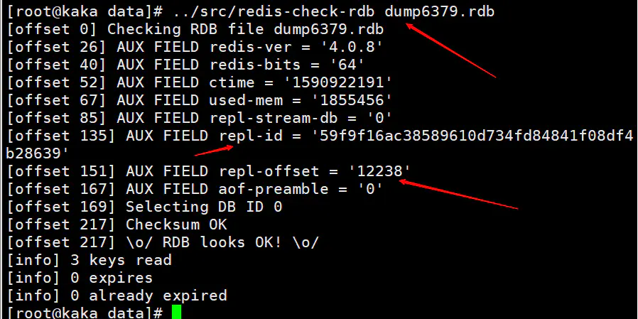 在主节点执行shutdown save命令时,进行了一次RDB持久化会把runid 和 offset保存到RDB文件中。可以使用命令redis-check-rdb查看该信息。