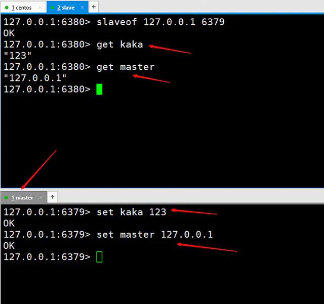 我们先测试一下看是否实现主从复制。在master这台服务器上执行俩个set kaka 123 和 set master 127.0.0.1,然后在slave6380端口是可以成功获取到的,也就说明我们的主从复制就已经配置完成了。但是在实现生产环境可不是就这样完事了,后边会在进一步对主从复制进行优化,直到实现高可用。